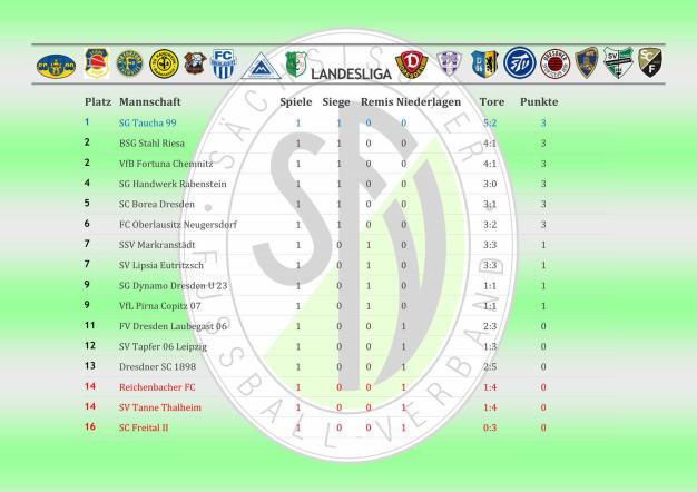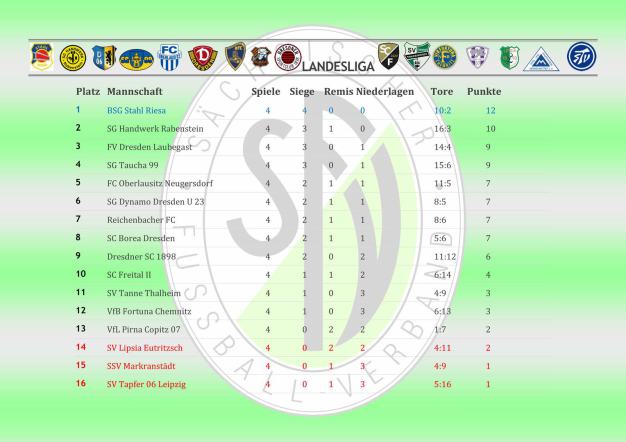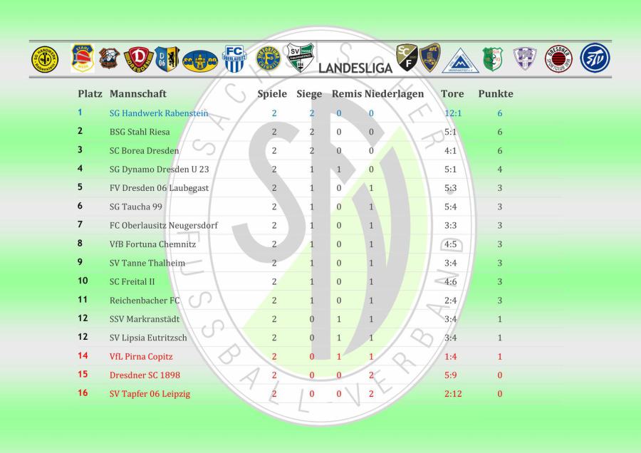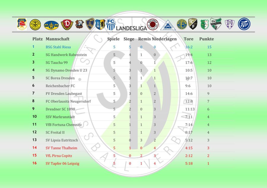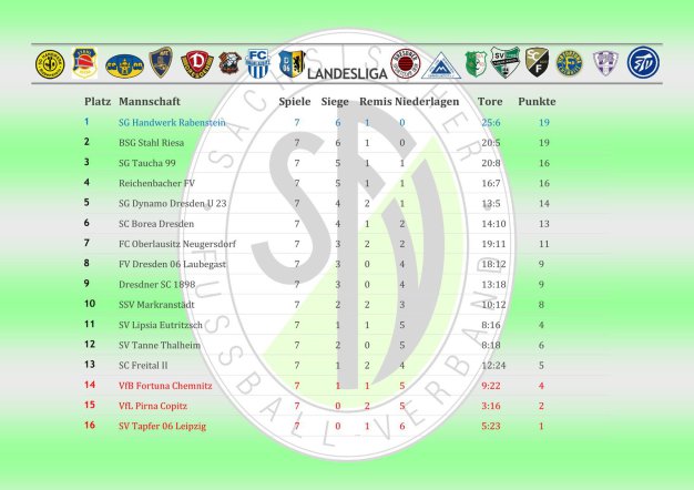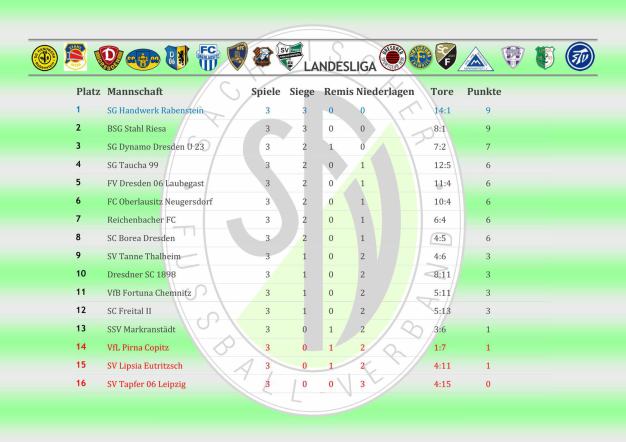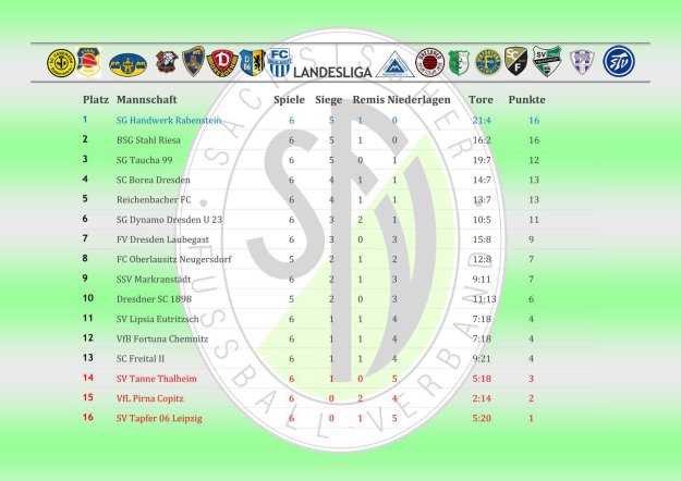 Vor dem Landespokalwochenende konnte das Spitzenduo ihre Positionen halten und ausbauen. Sowohl Spitzenreiter Rabenstein (4:2 im Derby bei der Fortuna) als auch Verfolger Riesa (4:3 Erfolg in Laubegast) gaben sich keine Blöße. Taucha spielte nur Unentschieden und so schloss der Reichenbacher FC nach einem 3:0 gegen Tapfer nach Punkten gleich. Dahinter rankiert die U 23 von Dynamo nach einem 3:0 gegen Eutritzsch und dem dritten Spiel in Folge ohne Gegentor.